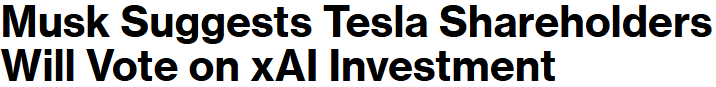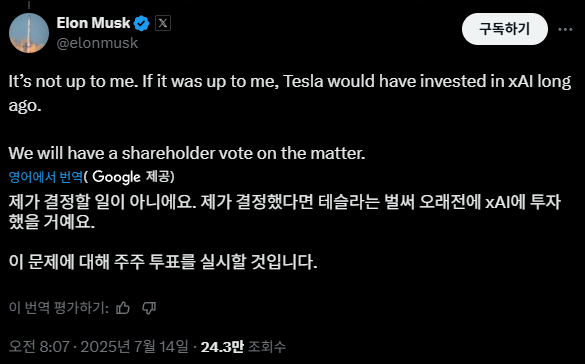 ## 머스크, '테슬라의 xAI 투자 여부 주주 투표에 부칠 것" ([원문](https://www.bloomberg.com/news/articles/2025-07-14/musk-suggests-tesla-shareholders-will-vote-on-xai-investment?srnd=homepage-americas))