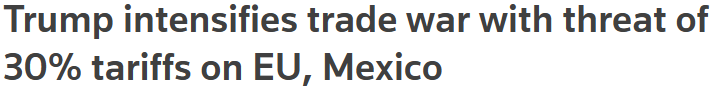 > 트럼프 대통령이 주요 교역 상대국인 유럽연합(EU)과 멕시코산 수입품에 8월 1일부터 30%의 관세를 부과하겠다고 위협함