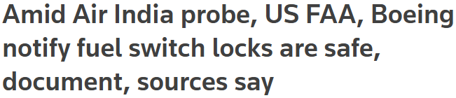 ## FAA·보잉, 에어인디아 사고 조사 중 '연료 스위치 안전' 결론 ([원문](https://www.reuters.com/business/aerospace-defense/amid-air-india-probe-us-faa-boeing-notify-fuel-switch-locks-are-safe-document-2025-07-13/))
