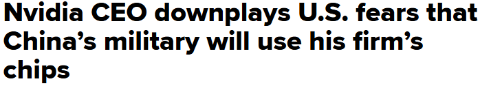 > 엔비디아 CEO 젠슨 황은 CNN 인터뷰에서 중국군이 엔비디아의 AI 칩을 사용할 가능성은 낮다고 전함