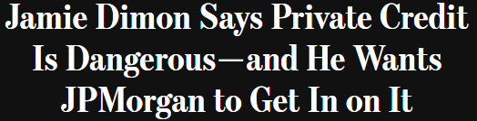 > * 다이먼은 2월 마이애미 행사에서 프라이빗 크레딧을 "금융 위기의 레시피"로 비유하며, 일부 대출자가 제대로 관리하지 않으면 문제가 발생할 수 있다고 지적함