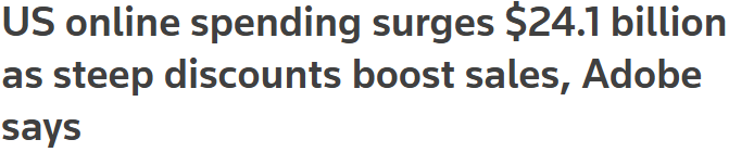 ## 미국 온라인 지출 241억 달러 급증?! ([원문](https://www.reuters.com/business/retail-consumer/us-online-spending-surges-241-billion-steep-discounts-boost-sales-adobe-says-2025-07-12/))